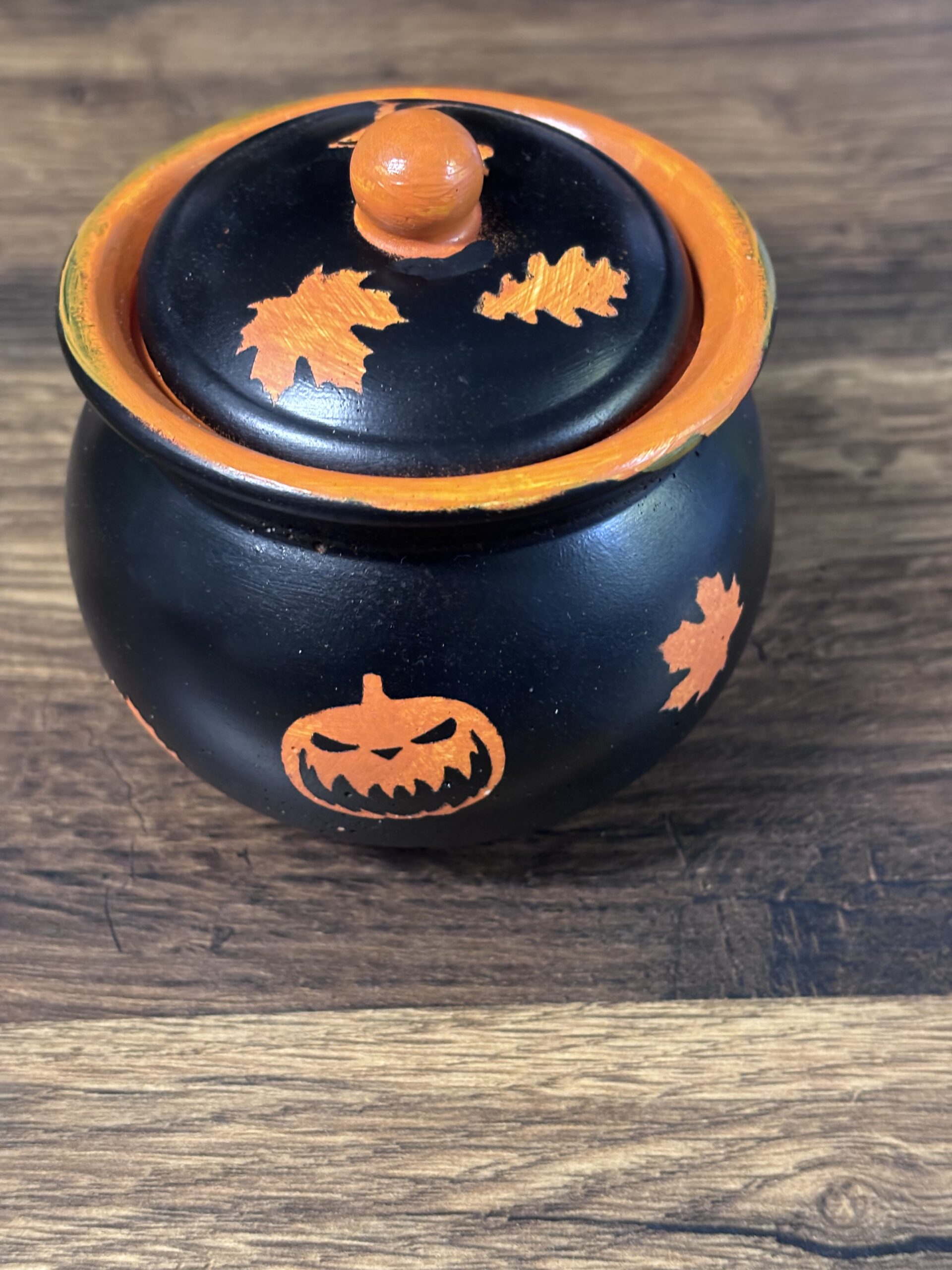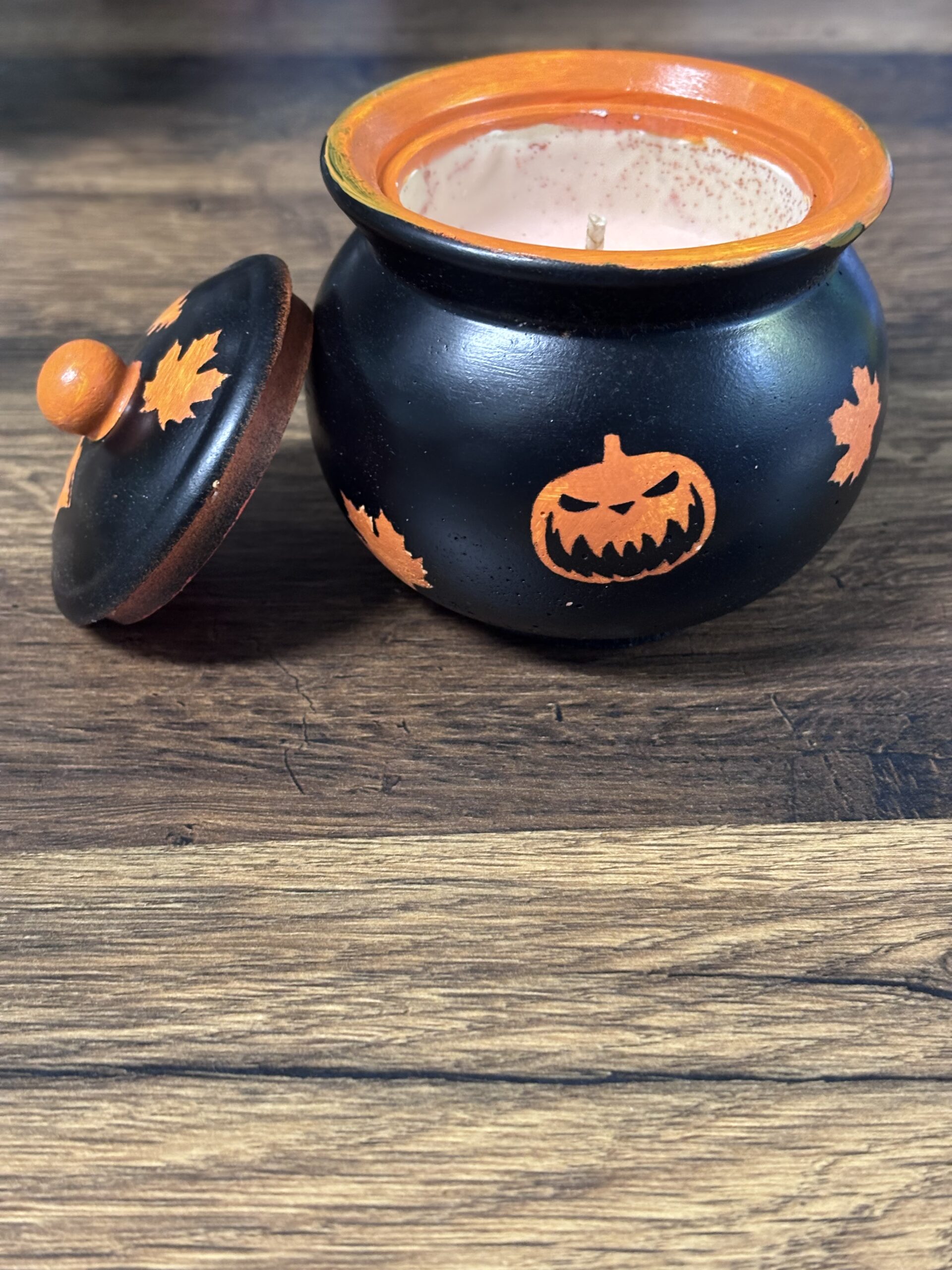 A „Boszorkány Főzete” gyertya egy kézzel festett, fekete–narancs árnyalatú tégelybe öntött, limitált Halloween-kiadás. A díszítést faragott töklámpás és őszi levelek motívumai adják, melyek a hűvös esték meleg, misztikus hangulatát idézik meg. Égése közben lágy, mégis fűszeres őszi illat tölti meg a szobát – mintha egy boszorkányüstből szállna fel a varázsillat. Különleges darab, amely egyszerre dekoráció és illatélmény.⚠️ A termék egyedileg készül, az elkészítési idő 3–5 munkanap.