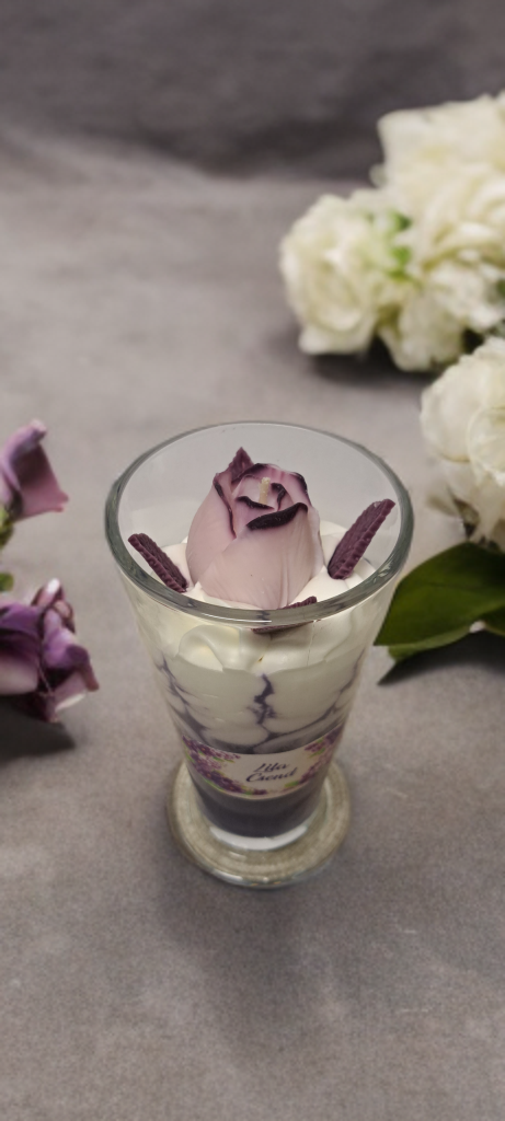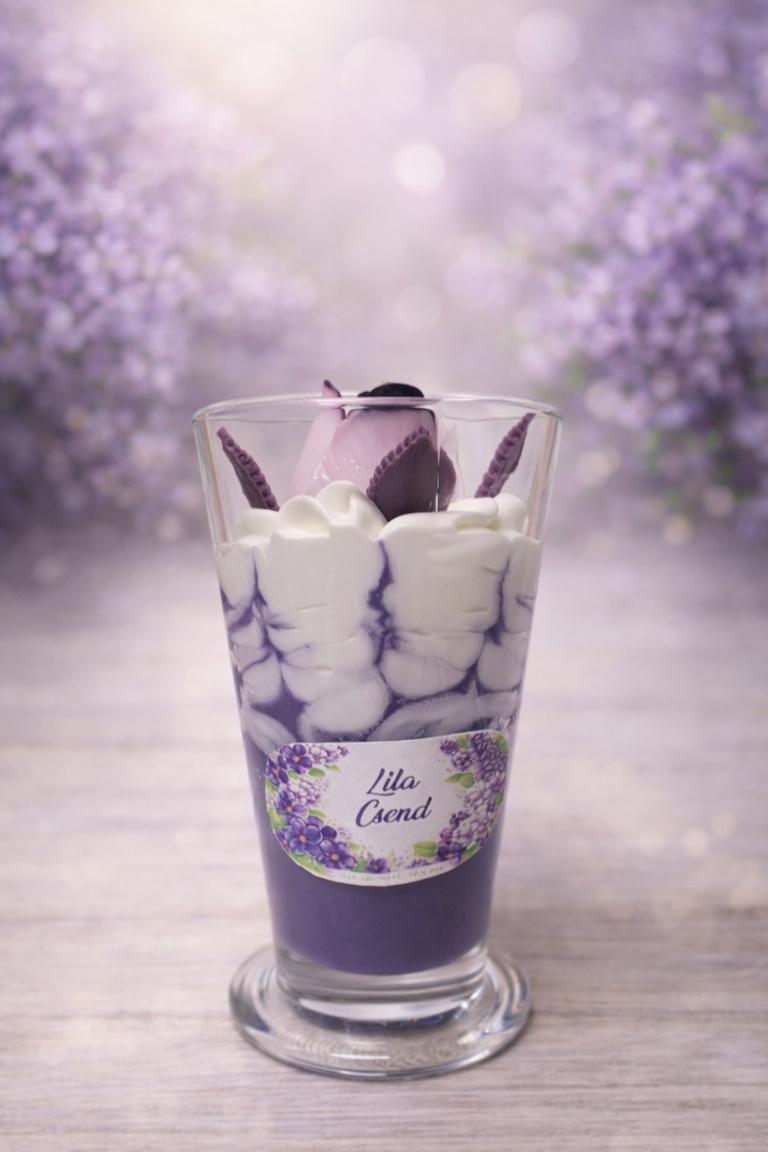 A Lila Csend egy elegáns, kézzel készített, rétegezett díszgyertya, amelyben a mély lila és a tiszta fehér harmonikusan találkozik. A pohár alján elterülő sötét ibolya árnyalat stabil alapot ad, fölötte finoman örvénylő fehér réteg, tetején pedig aprólékosan kidolgozott lila virágkompozíció teszi igazán különlegessé. Megjelenése nyugalmat, letisztultságot és egy csendes tavaszi alkony hangulatát idézi.
