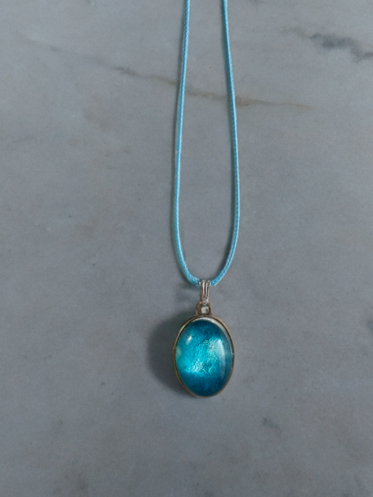 Türkizkék, kézzel készült medál, amely az óceán mélységének nyugalmát és titokzatosságát idézi meg.