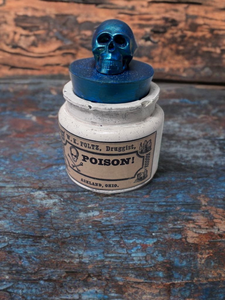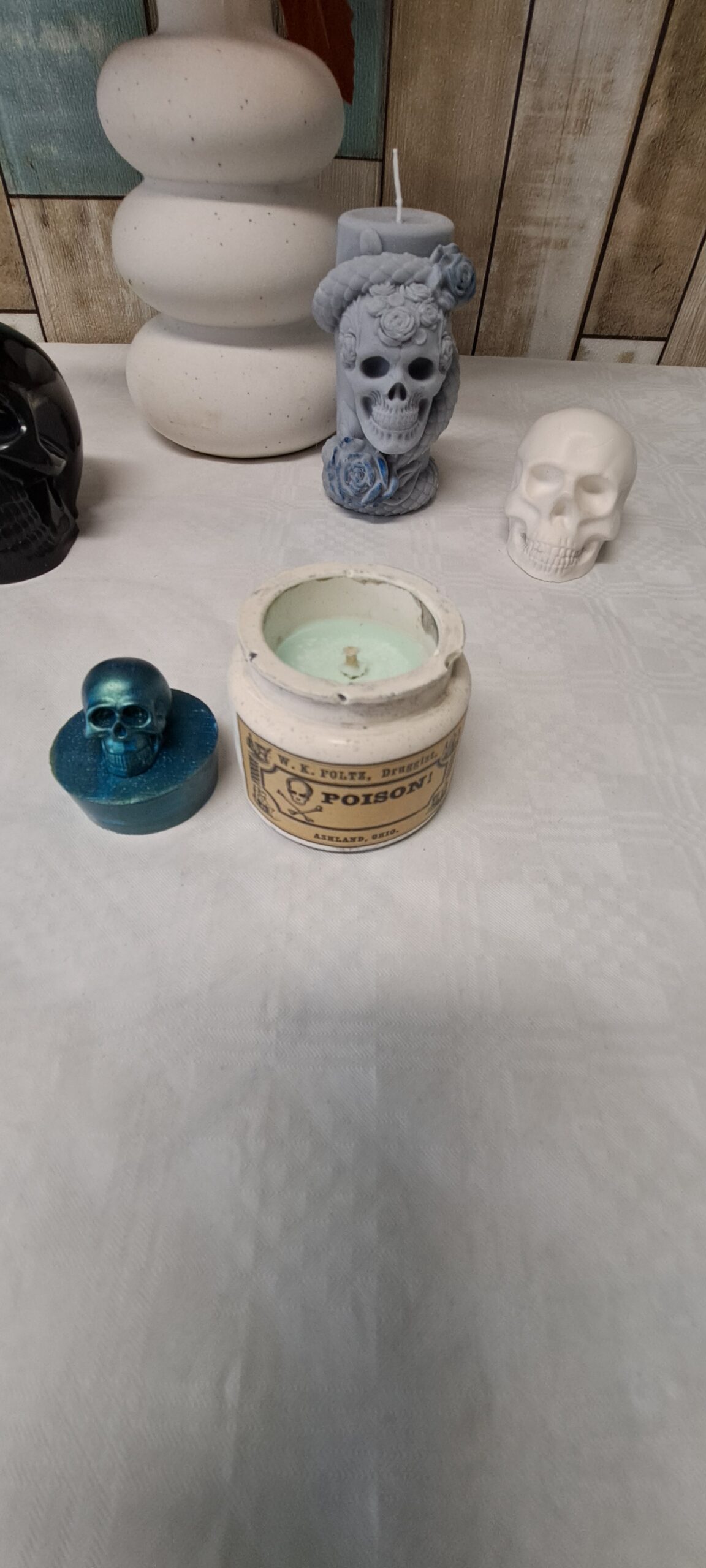 Ez a kézzel készített gyertya egy régi patikai méregüveget idéz meg, amelyen a klasszikus „POISON!” felirat figyelmeztet a veszélyre.